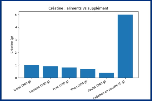⚠️ Les valeurs sont exprimées en grammes de créatine pour 1 kg d’aliment cru. La cuisson peut réduire ces chiffres de 10 à 30 %.
