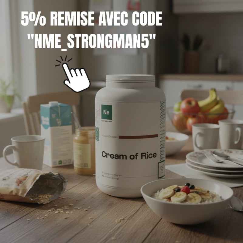 Quand tu pratiques le Strongman, tu réalises vite que l’énergie, ce n’est pas un concept abstrait. C’est concret, brut, vital. C’est ce qui te permet de garder ta vitesse sur un Yoke de 250 kg après 20 mètres. C’est ce qui te reste au moment d’arracher une Atlas Stone quand tu as déjà les avant-bras en feu. Dans ce contexte, la nutrition devient une arme. Et parmi toutes les sources de glucides que j’ai testées, la crème de riz Nutrimuscle fait clairement partie des options les plus propres, les plus digestes et les plus efficaces du marché. C’est un complément ultra simple… mais justement : parfois, ce sont les choses les plus simples qui fonctionnent le mieux.