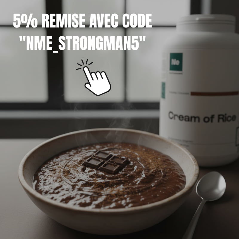 Si tu veux une version de qualité, digeste et abordable, la crème de riz Nutrimuscle reste pour moi un excellent choix, surtout avec -5 % via le code NME_STRONGMAN5.