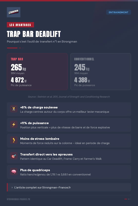 Le ratio moment de force hanche/genou passe de 3,68:1 en conventionnel à 1,78:1 à la trap bar (Swinton 2011). Tes quads bossent nettement plus. Et en Strongman, cette force de jambes en position basse fait la différence sur l’Atlas Stone, le Loading Race ou le Yoke.